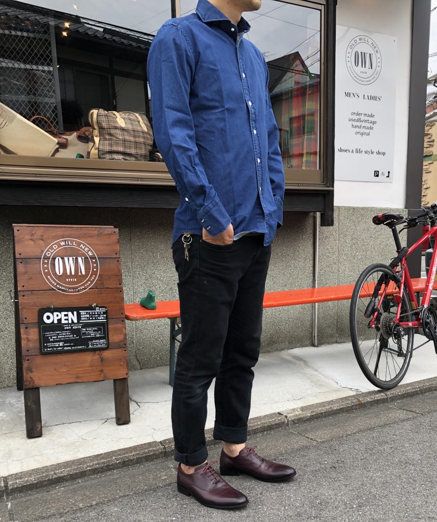 デニムシャツはカジュアルなイメージがありますが、形を変えて作ればドレスシャツのような装いで着て頂けます。