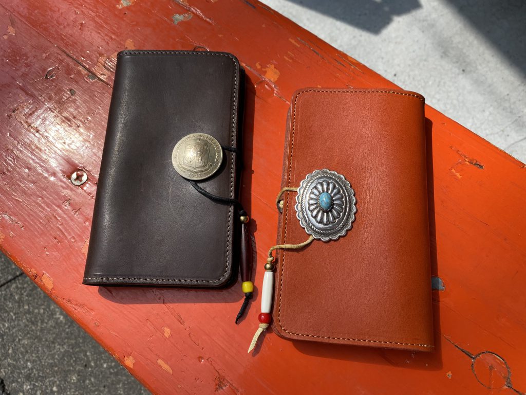大きなコンチョにくるっと革紐を巻きつけて止める、お財布のようなデザインです。