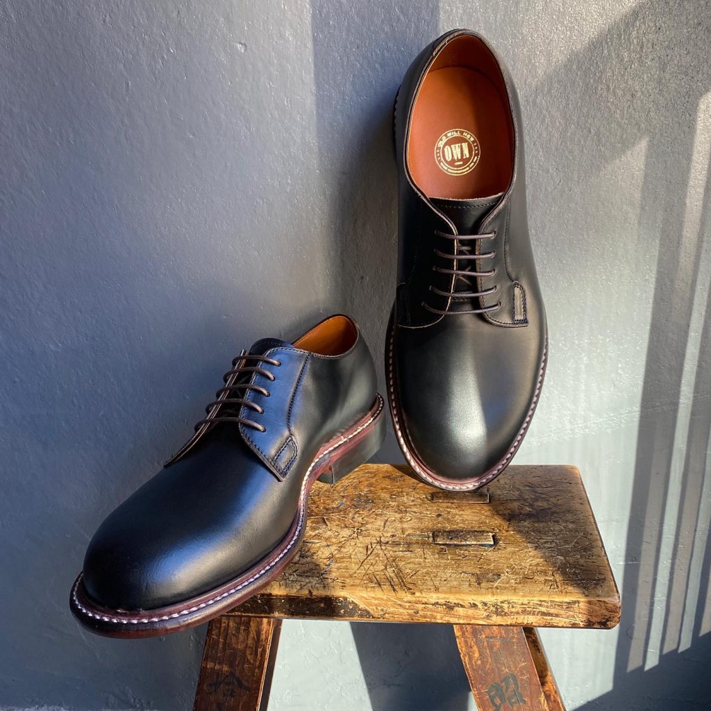 適度なボリュームのあるダービーシューズに、レザーはホーウィン社のクロムエクセル黒。無骨でカッコいい一足に仕上がりました😎太めのパンツとも相性抜群です👍🔥