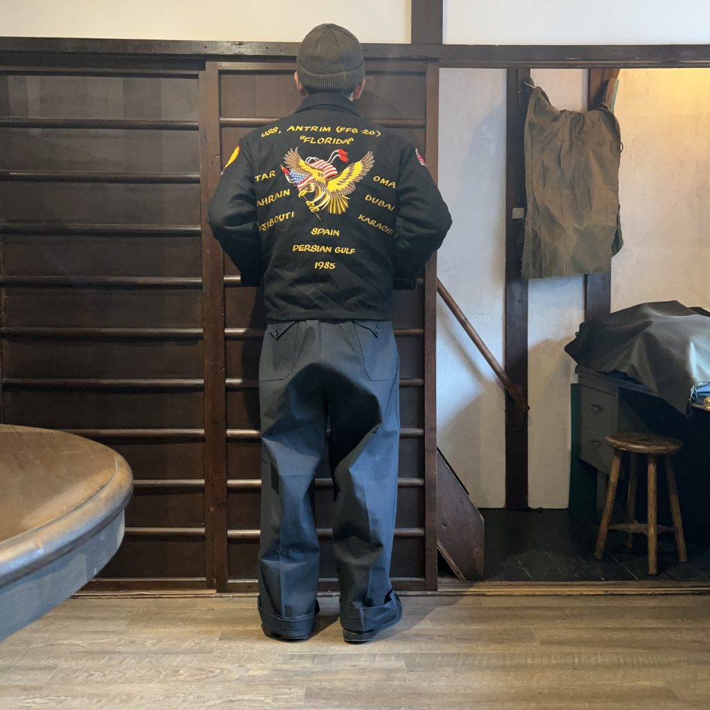 背中の刺繍がインパクト大なジャケットにそれに負けず劣らずのボリュームのあるパンツを合わせてコーディネート。