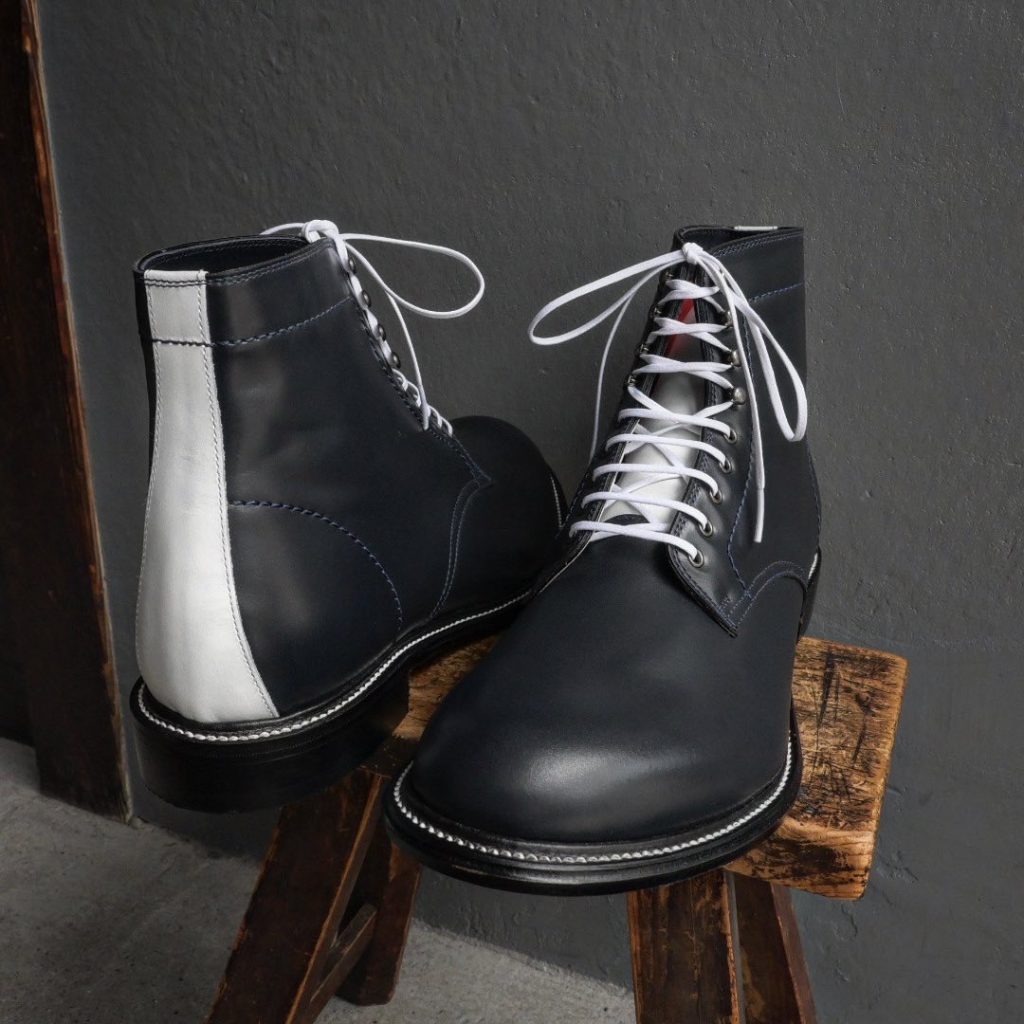 ネイビーベースにポイントでホワイトを取り入れたレースアップブーツ。