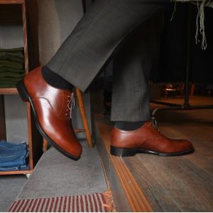 内羽根プレーントゥというフォーマルなデザインでありながら、カラーリングでたっぷり遊び心を入れた、人と差のつくビジネスシューズ。