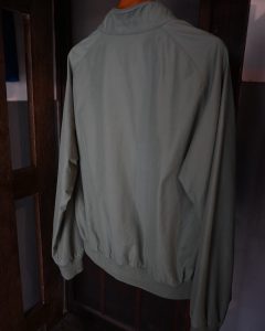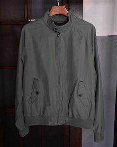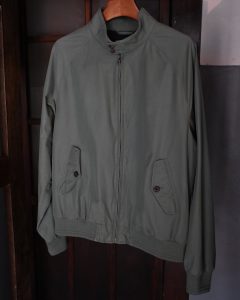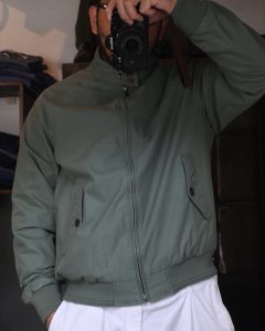 淡いグリーンカラーのハリントンジャケット。
