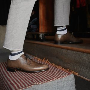 革靴を日常的に履くライフスタイルを提案するべく、店舗内には革靴に合わせてセレクトされた洋服や小物もずらりと並ぶ。
