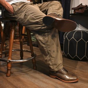 バックステイ(かかと部分の革)にだけ同素材のダークブラウンを取り入れて、さりげないコンビデザインに。