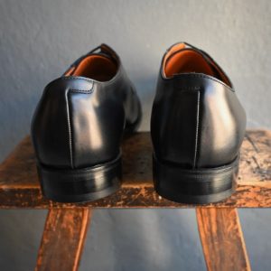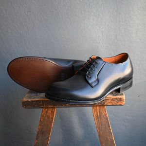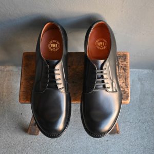 シンプルな外羽根プレーントゥは、幅広いスタイリングに合わせられる汎用性の高いデザイン。黒のプレーンダービーは、一足は持っていて間違いのない革靴です。