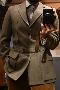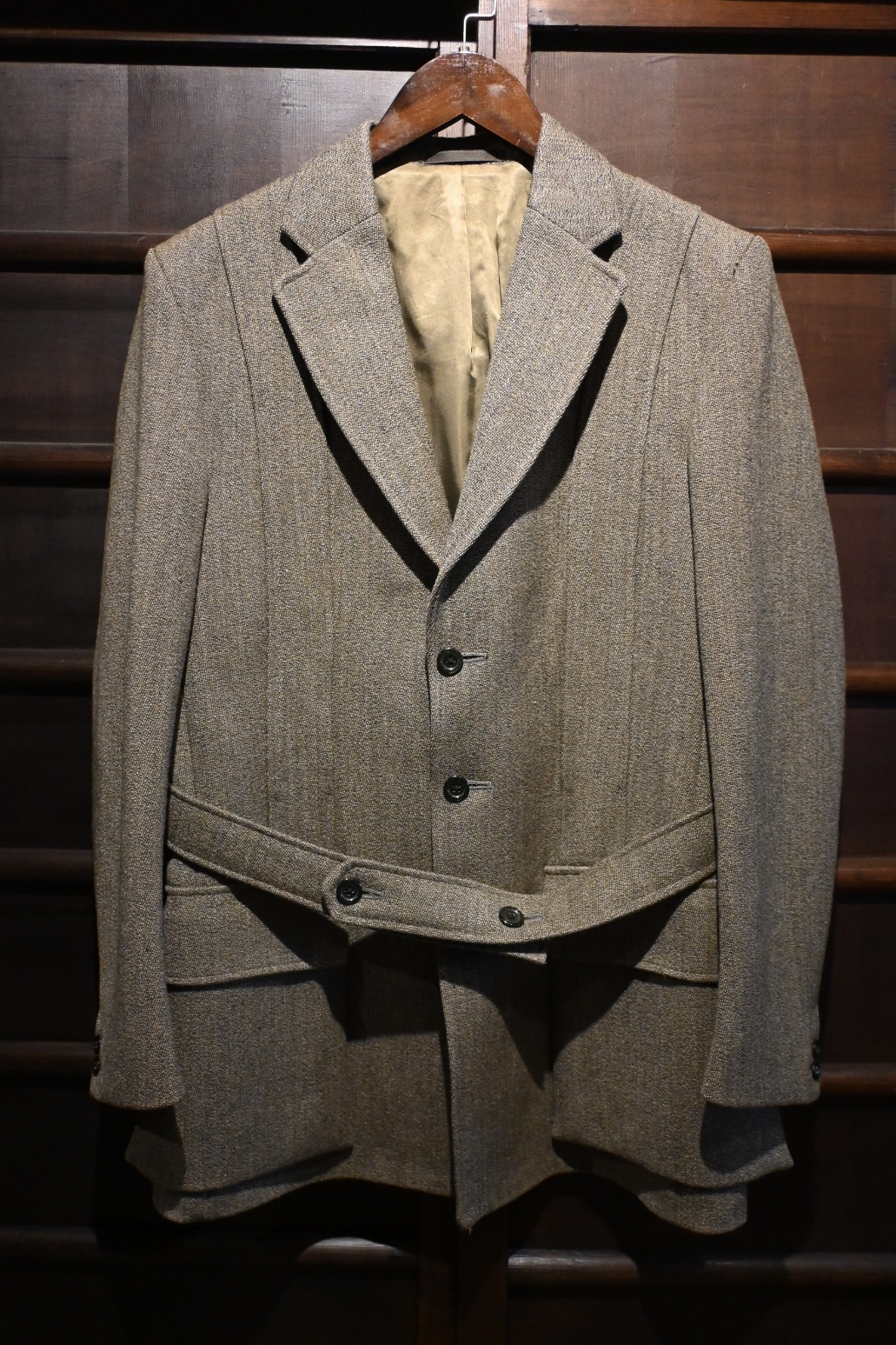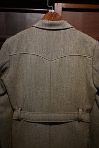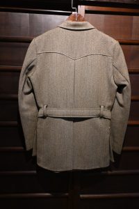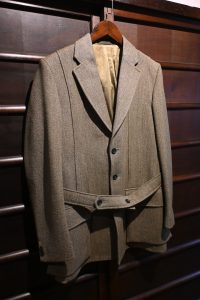 ウール主体の肉感ある生地と、ウエストベルト付きのクラシックなカッティングが男らしさを引き立てます。