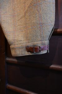 裾のレザーストラップが英国的ムードを引き締め、無骨さと上品さを両立。