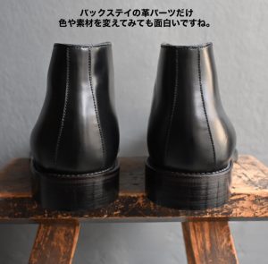 バックステイは縫い割りを覆ったデザイン。ここの革パーツだけ、色や素材を変えてアクセントにしてみるのも面白いと思います😄オーダーシューズならではの色遊びを自由に楽しんでみてください😄