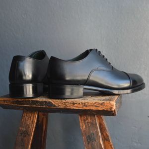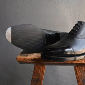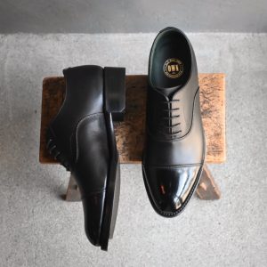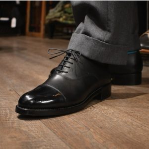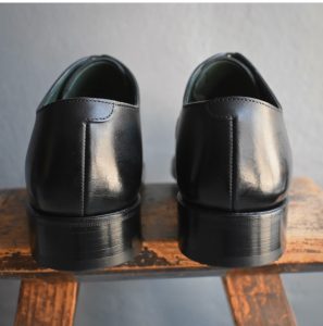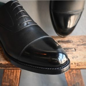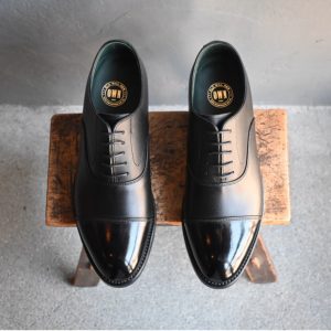 つま先へのお化粧(ハイシャイン/鏡面磨き)を施した、黒の内羽根ストレートチップ。